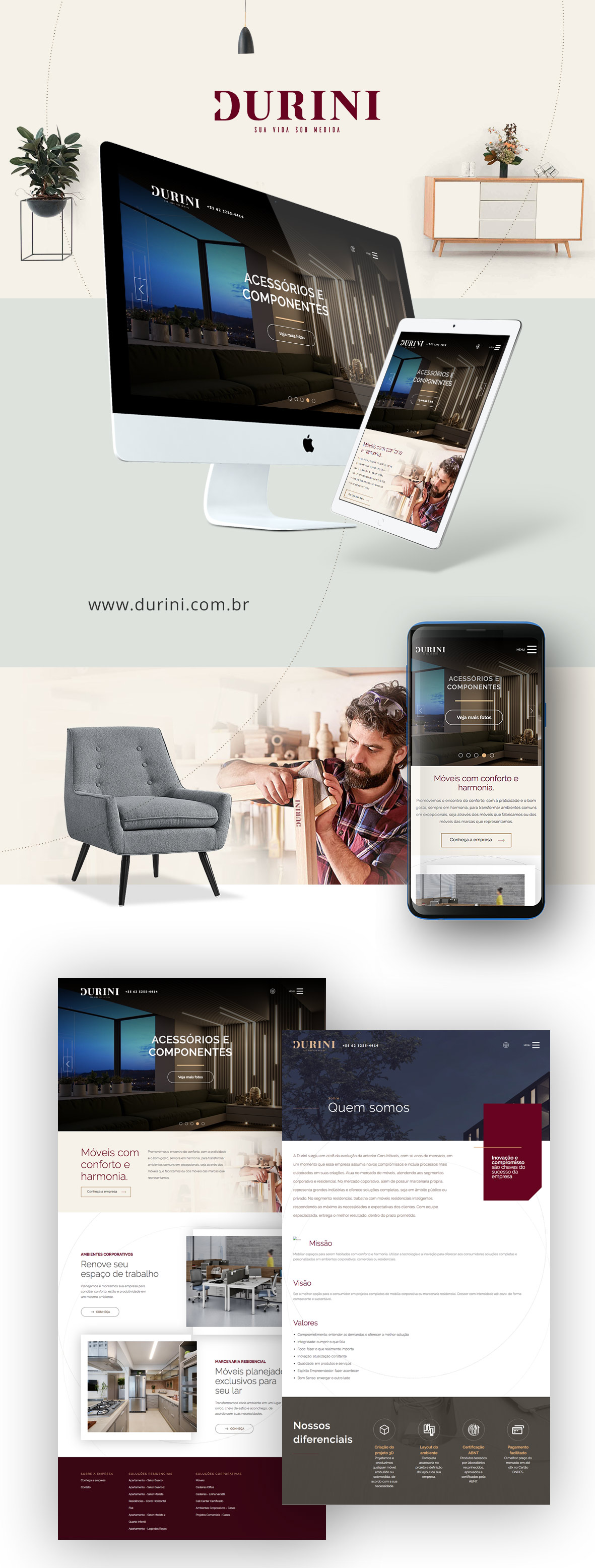 E para criar seu website, fizemos um processo parecido: investimos um tempo entendendo melhor a essência do trabalho deles, fizemos uma vasta pesquisa do segmento em que atuam, e criamos algo que representasse, principalmente do ponto de vista de visual, quem é a Durini.